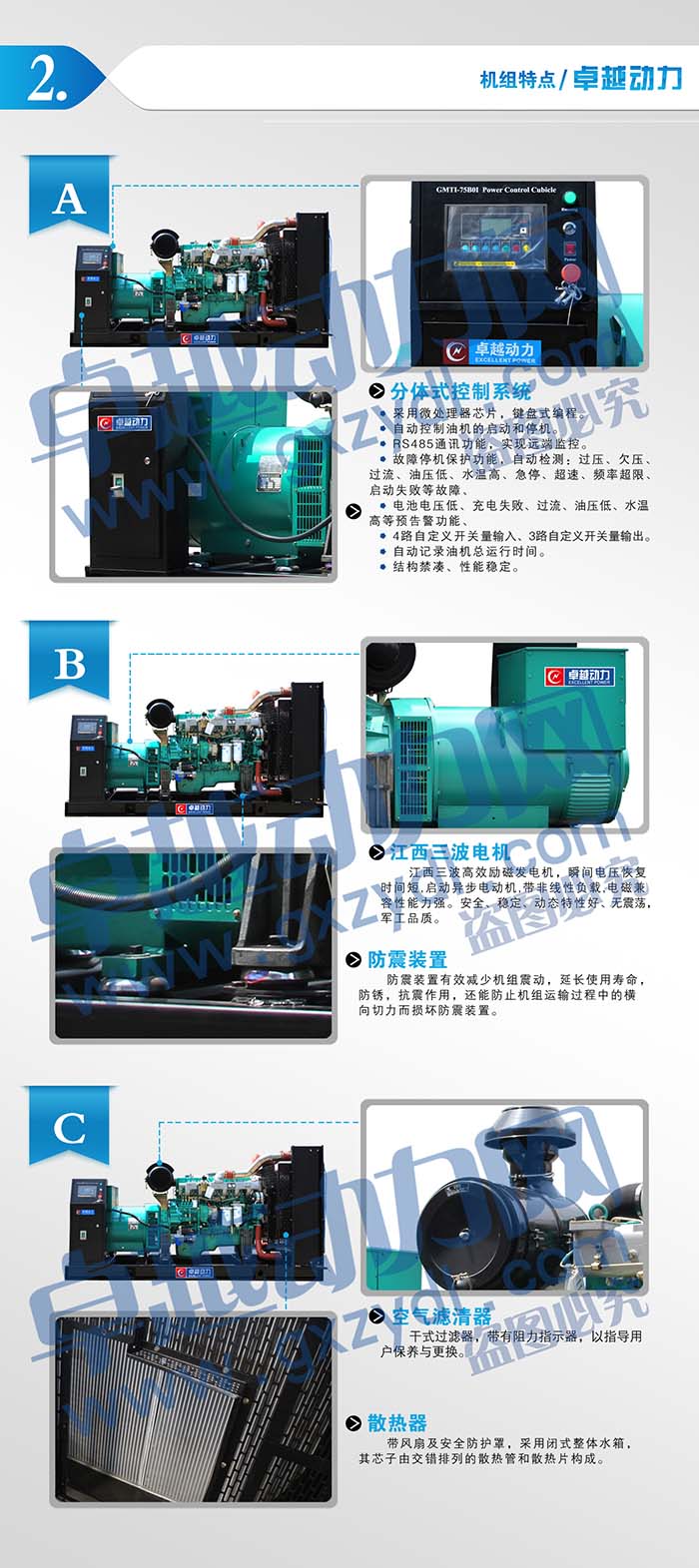 采用國內(nèi)先進(jìn)的柴油發(fā)電機(jī)組專用多功能智能控制模塊,具有自動(dòng),手動(dòng)啟動(dòng)控制(可選)、自動(dòng)保護(hù)功能、自動(dòng)保護(hù)功能、自動(dòng)市電/發(fā)電轉(zhuǎn)換、自動(dòng)并機(jī)及遠(yuǎn)程通訊和液晶顯示頻顯示各種參數(shù)等功能,有多種智能控制模塊供選擇。